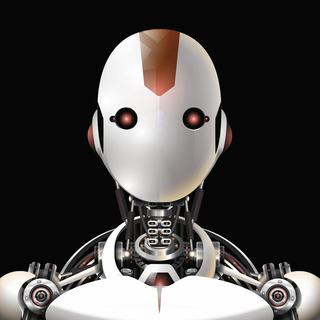 Digital avatar of Bertil, a humanoid robot with a smooth white face and glowing red eyes
