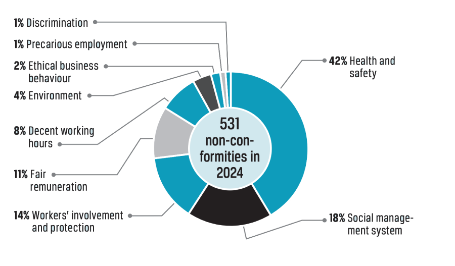 In 2024, 51 audits were conducted in high-risk countries within the framework of amfori BSCI. In total, 531 non-conformities were identified, mainly related to working environment, working hours, and lack of awareness of rights. No zero-tolerance findings, such as child labour or forced labour, were detected.